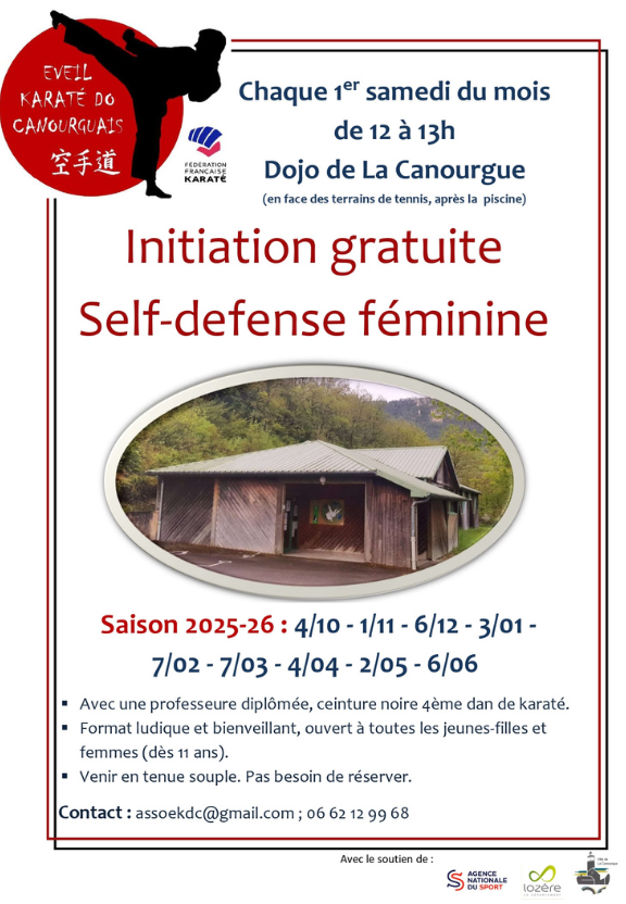 Chaque premier samedi du mois, de 12h à 13h, le dojo de La Canourgue accueille une séance gratuite d’initiation à la self-défense féminine. Animée par une professeure diplômée, ceinture noire 4e dan de karaté, cette activité s’adresse à toutes les jeunes filles et femmes dès 11 ans. Dans une ambiance ludique, bienveillante et sécurisante, vous apprendrez des gestes simples et efficaces pour gagner en confiance et mieux vous protéger au quotidien. Aucune réservation nécessaire : il suffit de venir en tenue souple et de se laisser guider ! 📅 Prochaines dates : 4/10 – 1/11 – 6/12 – 3/01 – 7/02 – 7/03 – 4/04 – 2/05 – 6/06. |