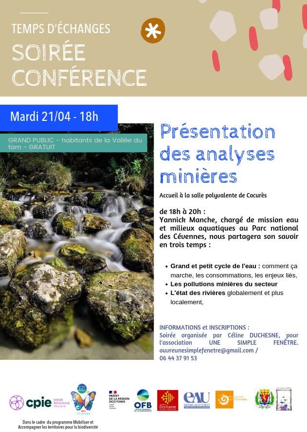 L’état des rivières globalement et plus localementCe temps d’échanges destiné au grand public et aux habitants de la Vallée du Tarn est gratuit.